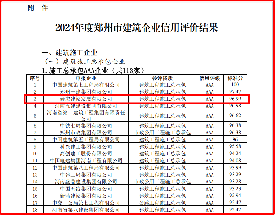 近日,郑州市城乡建设局公布2024年度郑州市建筑企业信用评价结果,泰宏建设凭借卓越的企业管理水平、过硬的项目质量、优异的合同履约能力、良好的市场行为记录以及高度的社会责任感,荣获“建筑施工企业AAA级信用等级评价”,标志着公司在企业诚信建设、综合实力与品牌声誉方面达到行业标杆水平,获得了官方与市场的权威认可!