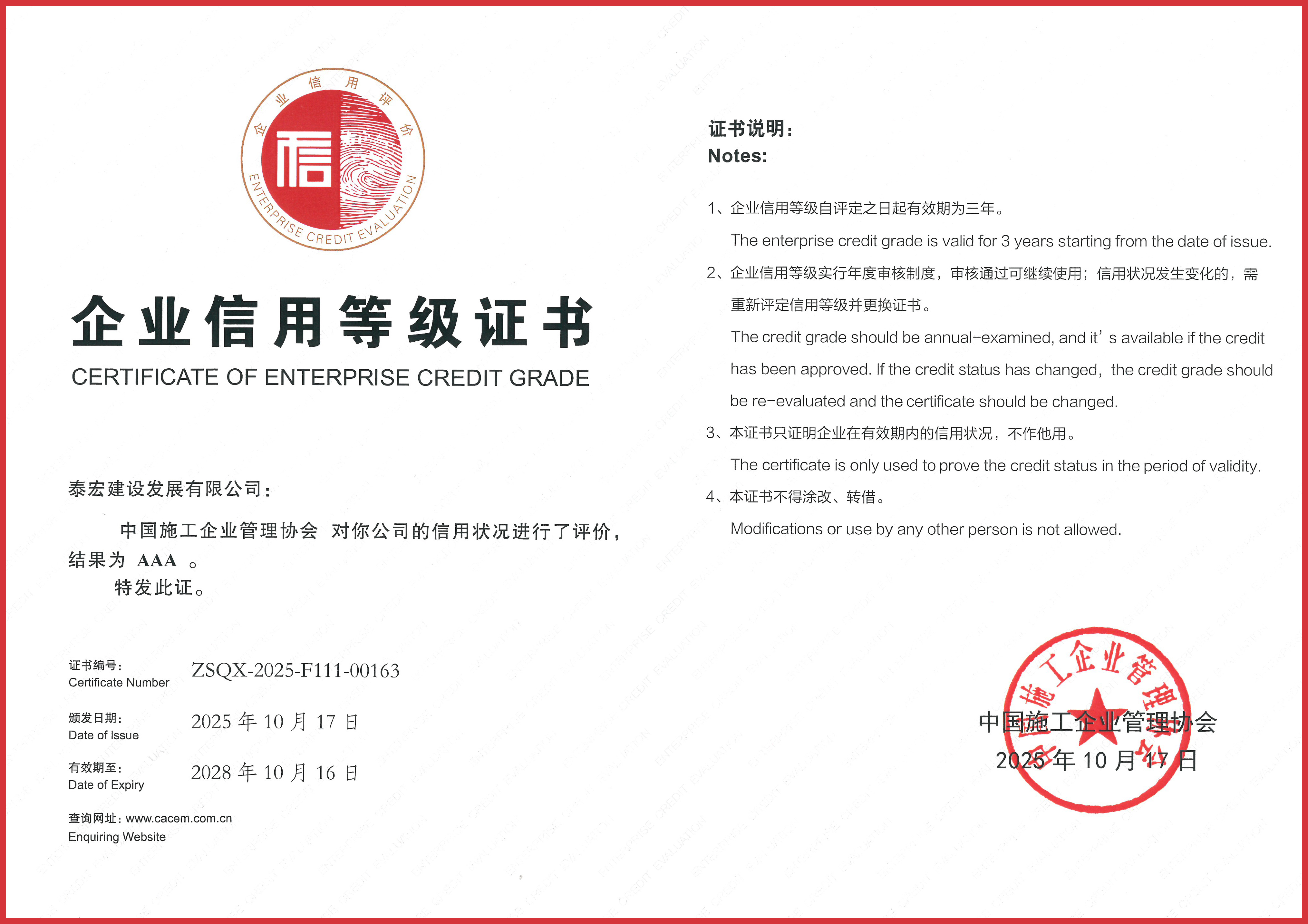 此次“AAA级信用企业”认证,是对泰宏建设在信用管理、经营效益、社会贡献等维度综合实力的高度认可,标志着公司在风险控制、合规经营等方面达行业领先水平,为企业市场竞争提供了强有力的信用保障。